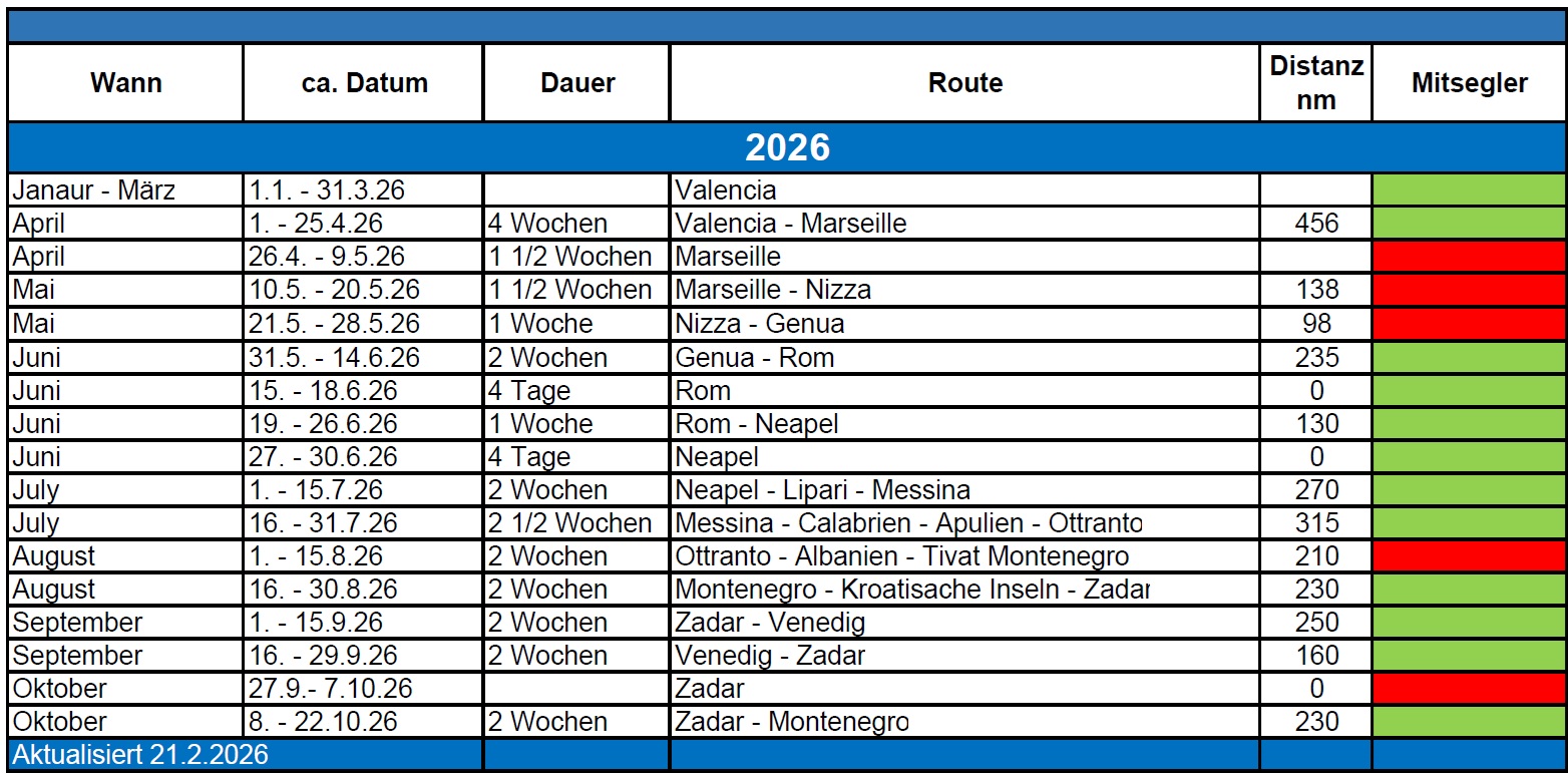 Der Törnplan ist eine grobe Übersicht über die zur Zeit geplante Route. Wir werden je nach den aktuellen Gegebenheiten die Routenplanung anpassen und verfeinern. Kontaktiert uns, wenn Ihr gerne eine Etappe oder Teiletappen mitsegeln wollt. Wir freuen uns auf Eure Kontaktaufnahme.